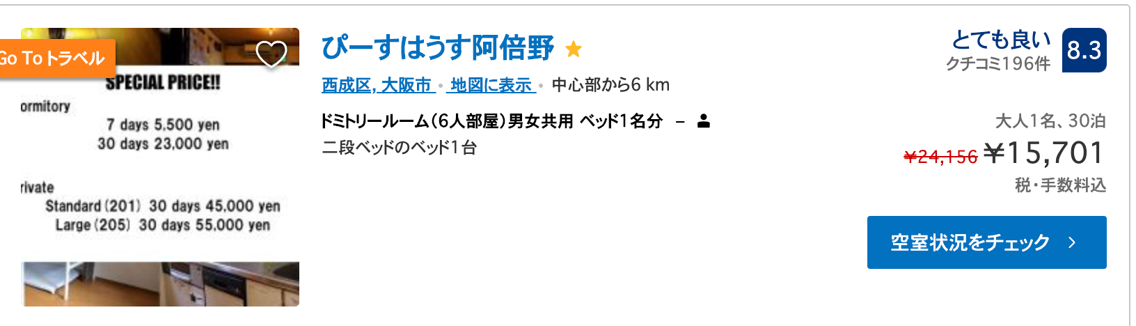 一番安いドミトリーは一ヶ月15000円台で滞在できます。