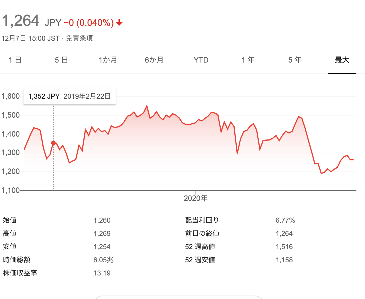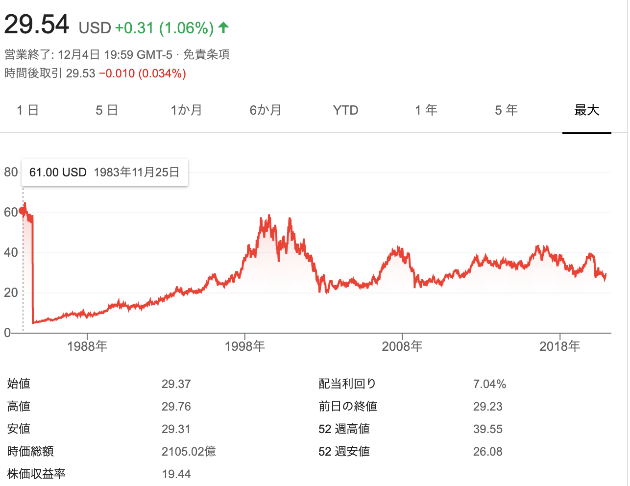 現在7%の高配当利回りです。しかしダウの好調の中、株価は完全に出遅れ銘柄となっています。