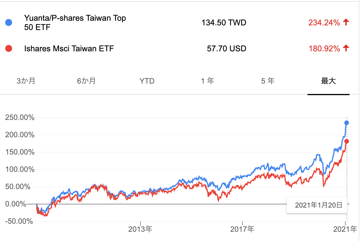 しかし過去のリターンはTSMCの組み入れ比率の高い元大台灣50の方が高いです。