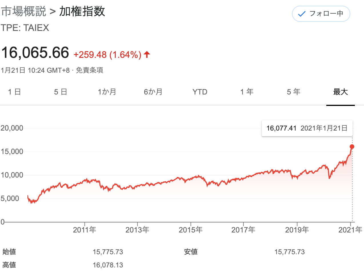 台湾の代表的指数、加権指数が1月21日場中ですが16000ポイントを突破しています。