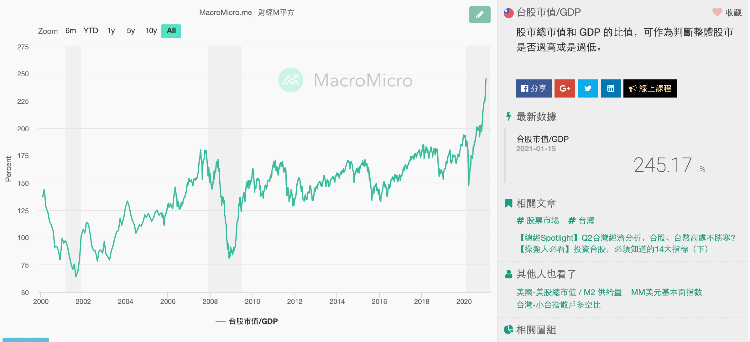 台湾株の時価総額と台湾のGDPを割ると245%となっています。