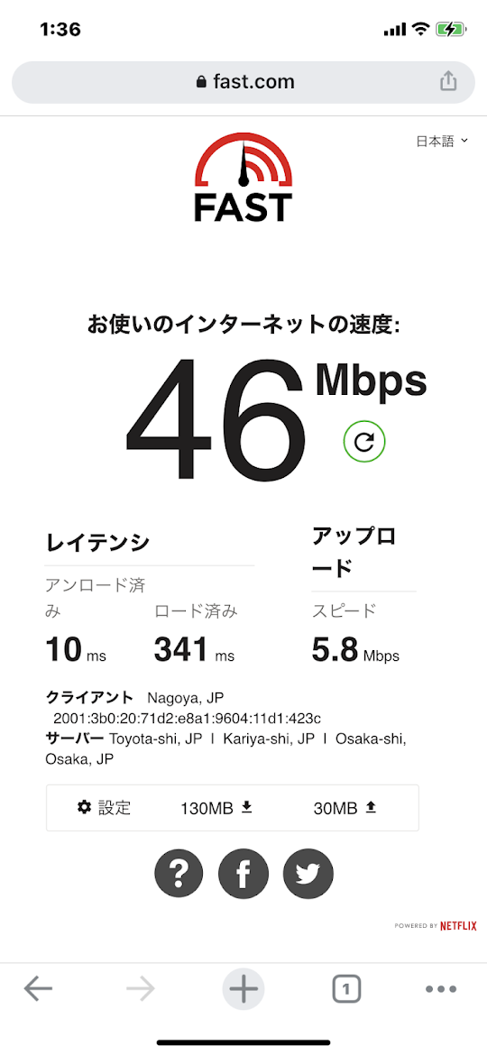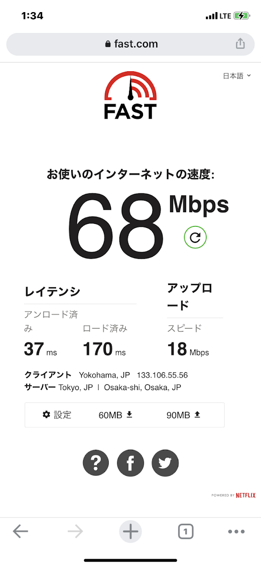 深夜1:30分は68Mbpsと変わらず爆速。