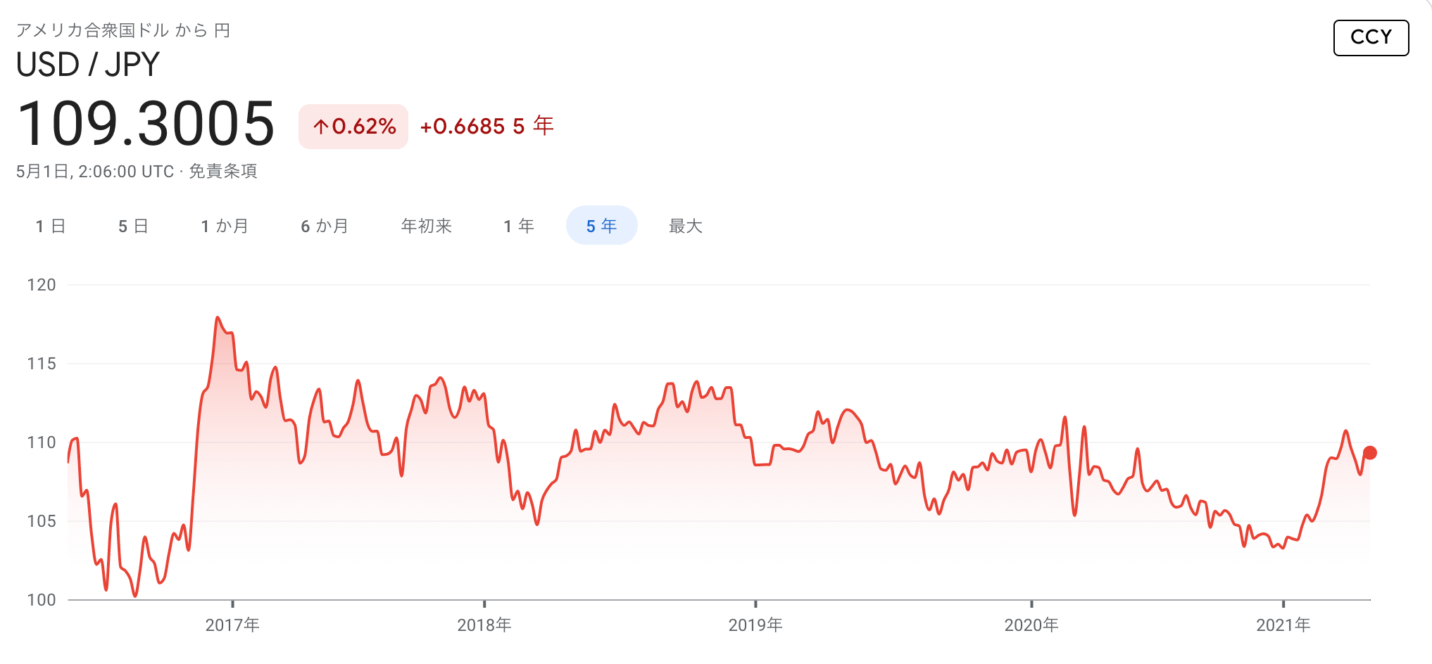 前月が110.7円なので1円ほどの円高。ずっと100円から110円あたりで安定しています。