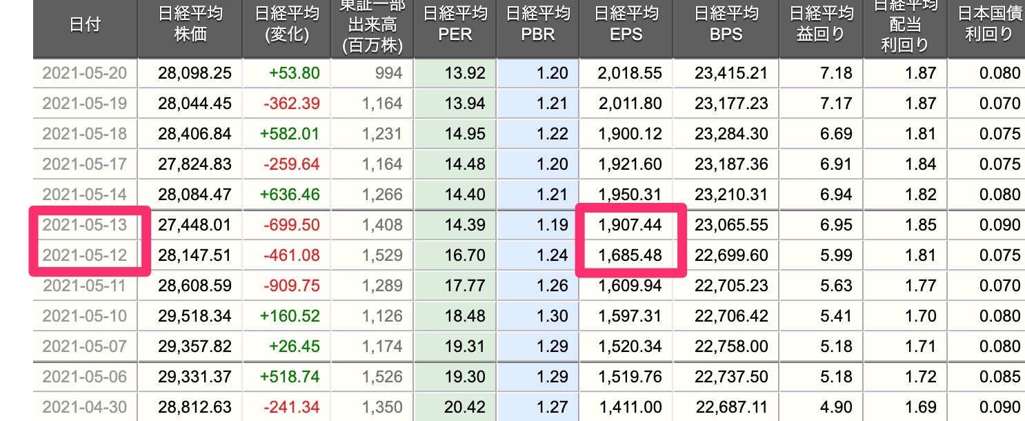 最新のデータですと5/20現在日経225の一株利益が2,018円と2000円を超えています。