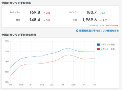 1,700円の値上がりです。1ヶ月一回満タンにすると1,700円×12ヶ月=20,400円