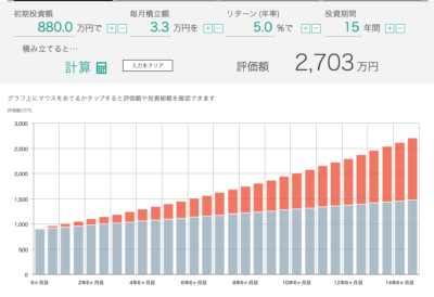 予想リターン5%として資産880万円・毎月3.3万円積立を15年続けるとすると