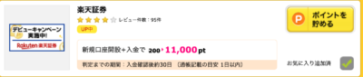 ハピタス経由で楽天証券の口座を新規開設して1ヶ月以内に5万円を入金すると11,000ポイントがもらえます。