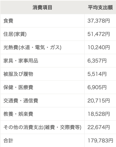 また総務省統計局の調査データをもと計算すると家賃込みでおよそ18万円