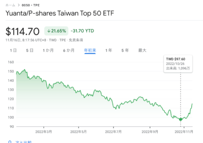 私が投資をしているETF、台湾の時価総額の大きい上位50社へ投資をする「元大台灣50」も底打ち。