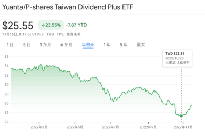 私の全投資で最大の投資先の一つ。時価総額の上位150社の中で配当の高い30社へ投資するETF「元大高股息」も深く下がっていたところから底打ち上昇へ転じました。