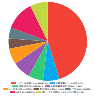 これにより外貨建て資産の上昇は抑えられましたが、金利低下による債券高と円高による為替ヘッジ債券の価格が上昇したため分散投資が効いている結果となりました。