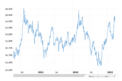 米銀行破綻で金融不安が起こり金価格が久しぶりに1オンスが2000ドルを突破しました。