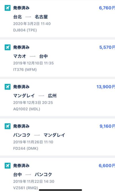 台北ー名古屋便で6,000円代のチケットを購入していました。