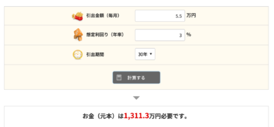 毎月5.5万円(年間66万円)を30年間取り崩しながら年間3%で運用したら元本はいくら必要か?