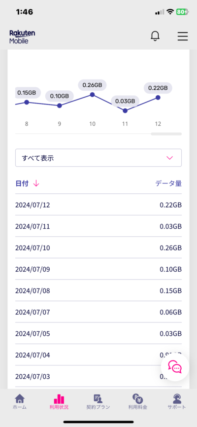 7/4は楽天で接続しているのを忘れて家で動画を見ていたので0.9GBも使ってしまった。