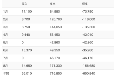 今月は155,000円ほど収支がマイナスで年間-65万円ほどの赤字。