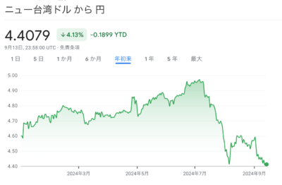 2024年7/10にドル円162円、台湾ドルは7/7に4.95円と超円安をつける。