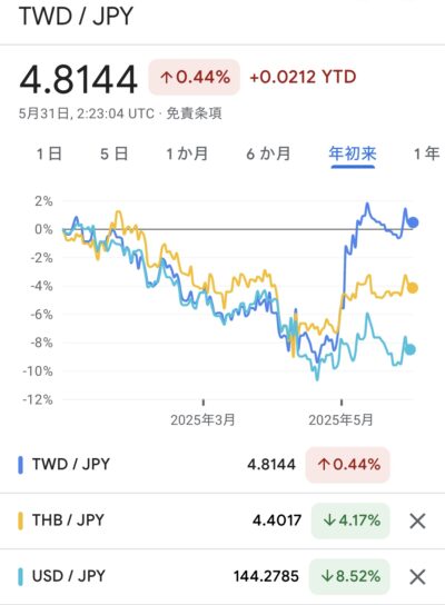 台湾ドル>タイバーツ>米ドルとアジア通貨が強いです。