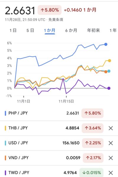 フィリピンペソ・タイバーツに対して大きく安くなっています。