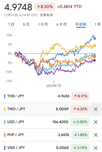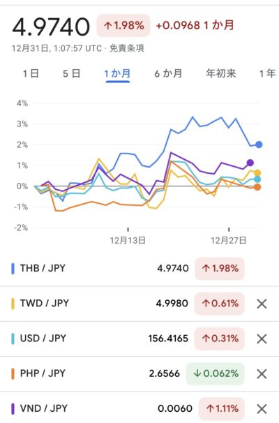 タイバーツが5円台に突入が年末に介入?があったようで4.9円・・・それでも信じられないぐらい高いです。