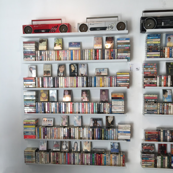 台湾・香港の中華、日本の音楽、洋楽がほぼ同じぐらいあります。展示してあるカセットテープとラジカセは全て購入可能だということです。