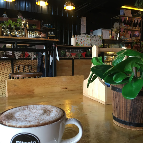 ビットコイン・ビストロ・カフェ。カフェモカ65B、コーヒー50B、ビットコインと書いてあるのでビットコインで支払いできるのかな?