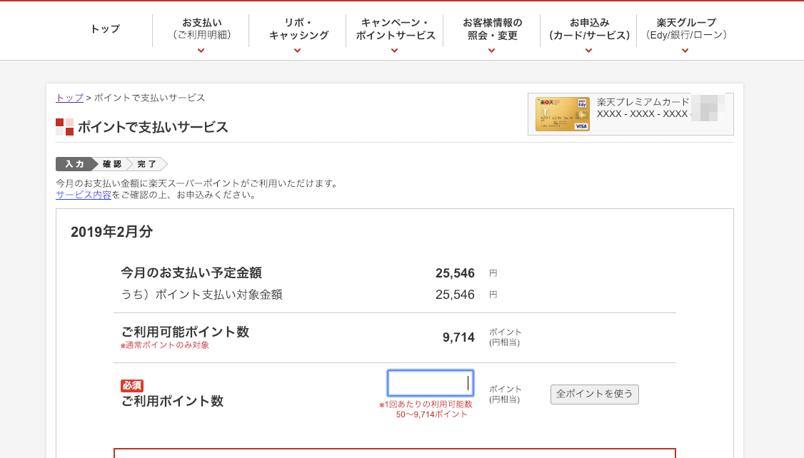 ポイントで支払う額を入力して確認画面ボタンを押す。