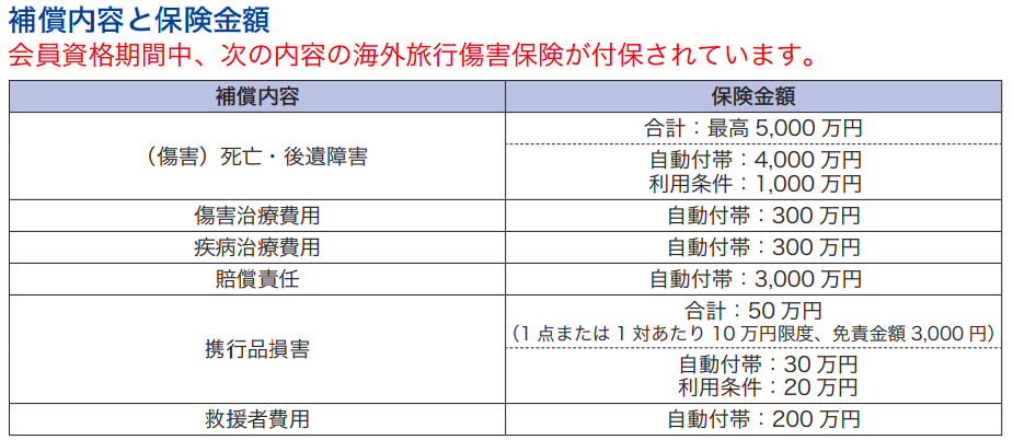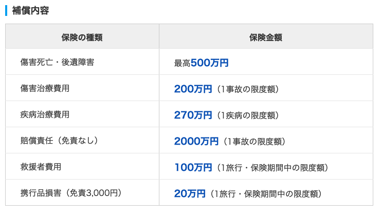 これでも不安な方は個別の海外保険や更にクレジットカードを持つのをお勧めします。