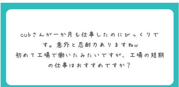 正直、この工場は家から近くて仕事は少しキツイですが私でも1ヶ月続けていくことができたので緩い職場なのだと思います。ここで定期的に働いてもいいのですが、それだとセミリタイア的にツマラナイので違う仕事を狙ってみたいと思います。