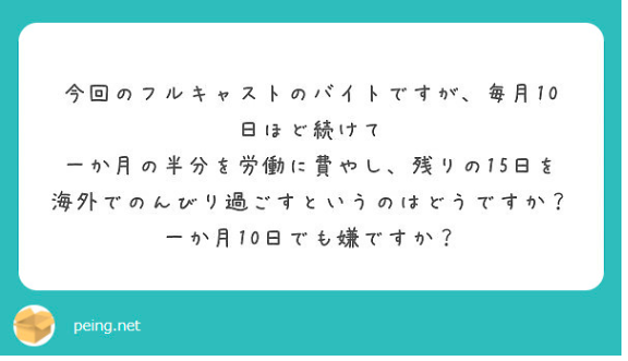 二週間で週5回の10日間勤務の年二回ぐらいが労働収入として丁度いいです。