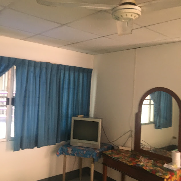 ベット・天井にファン・冷蔵庫・古いブラウン管テレビや簡素なイストテーブルが付いています。