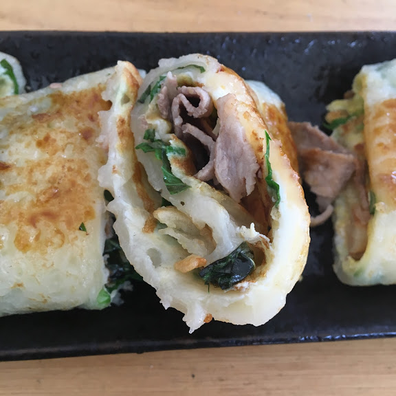 薄くクレープのように焼いた生地に溶いだ卵を重ねて鉄板で焼いたクレープのような食べ物です。