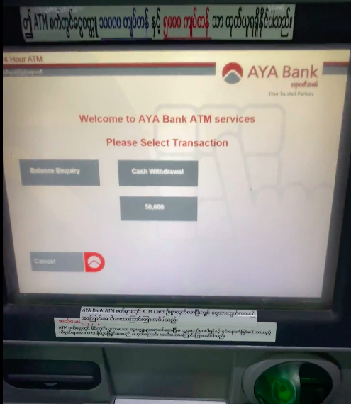 この内、右から2番目のAYAbankの赤いATMは一回で5万チャットしか引き出しができませんでした。