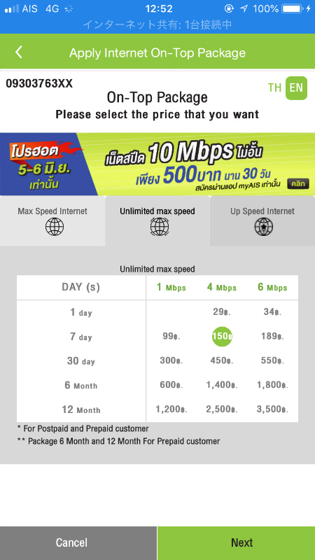 今回はAISの4Mbps1ヶ月使い放題サービスを利用。