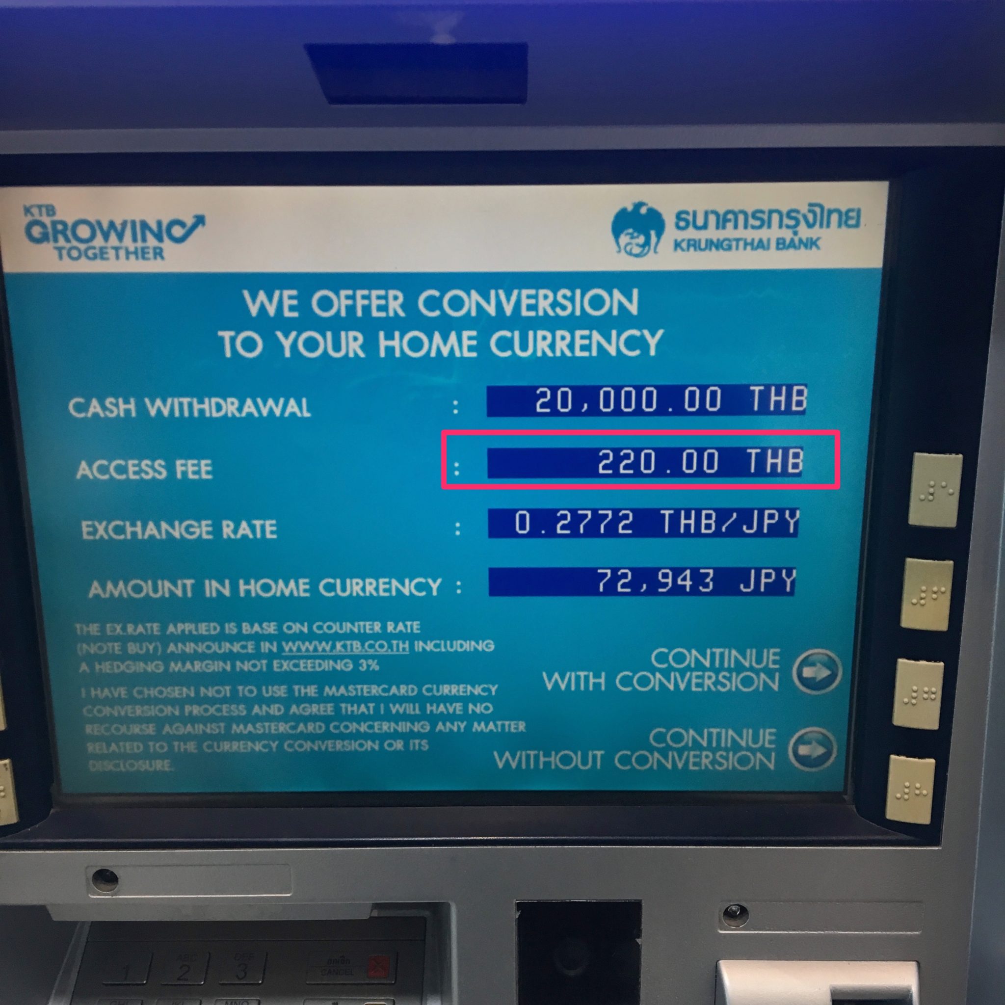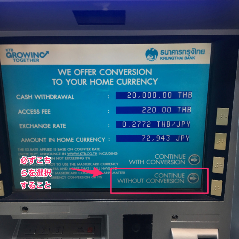 タイのATM最大の注意点!「 continue with conversion」は絶対に押さない!