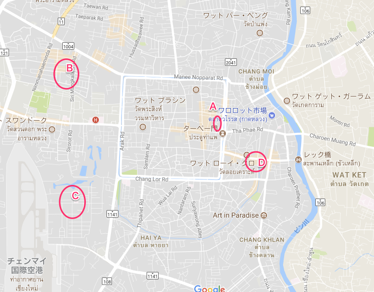 ニマンヘミン通りの近くにチェンマイ大学があり比較的家賃が安いようです。Dあたりのナイトマーケット周辺も安いホテルなどが沢山ありました。