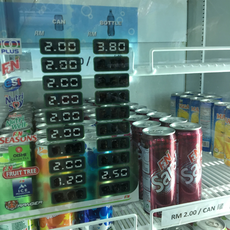 飲料水は安いですね。缶ジュース2リンギット。街のマンゴージュースなどは1リンギットから購入できます。
