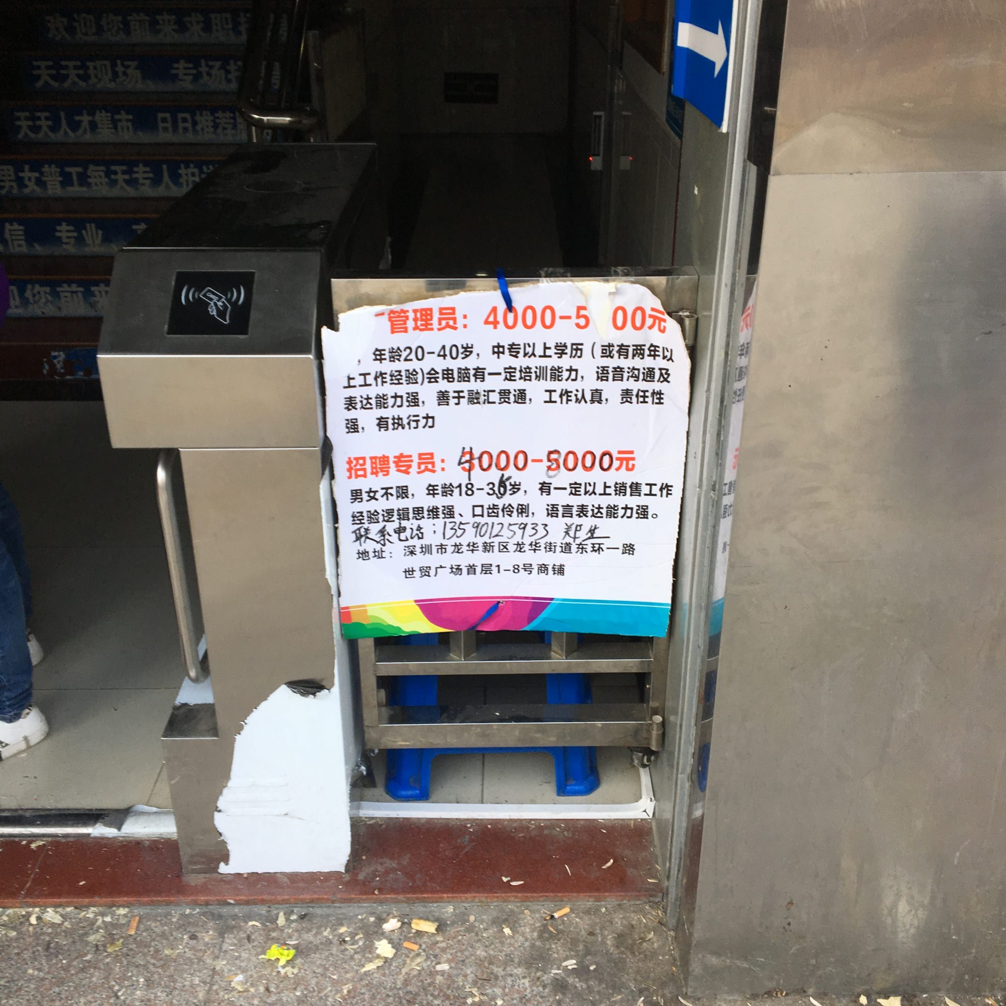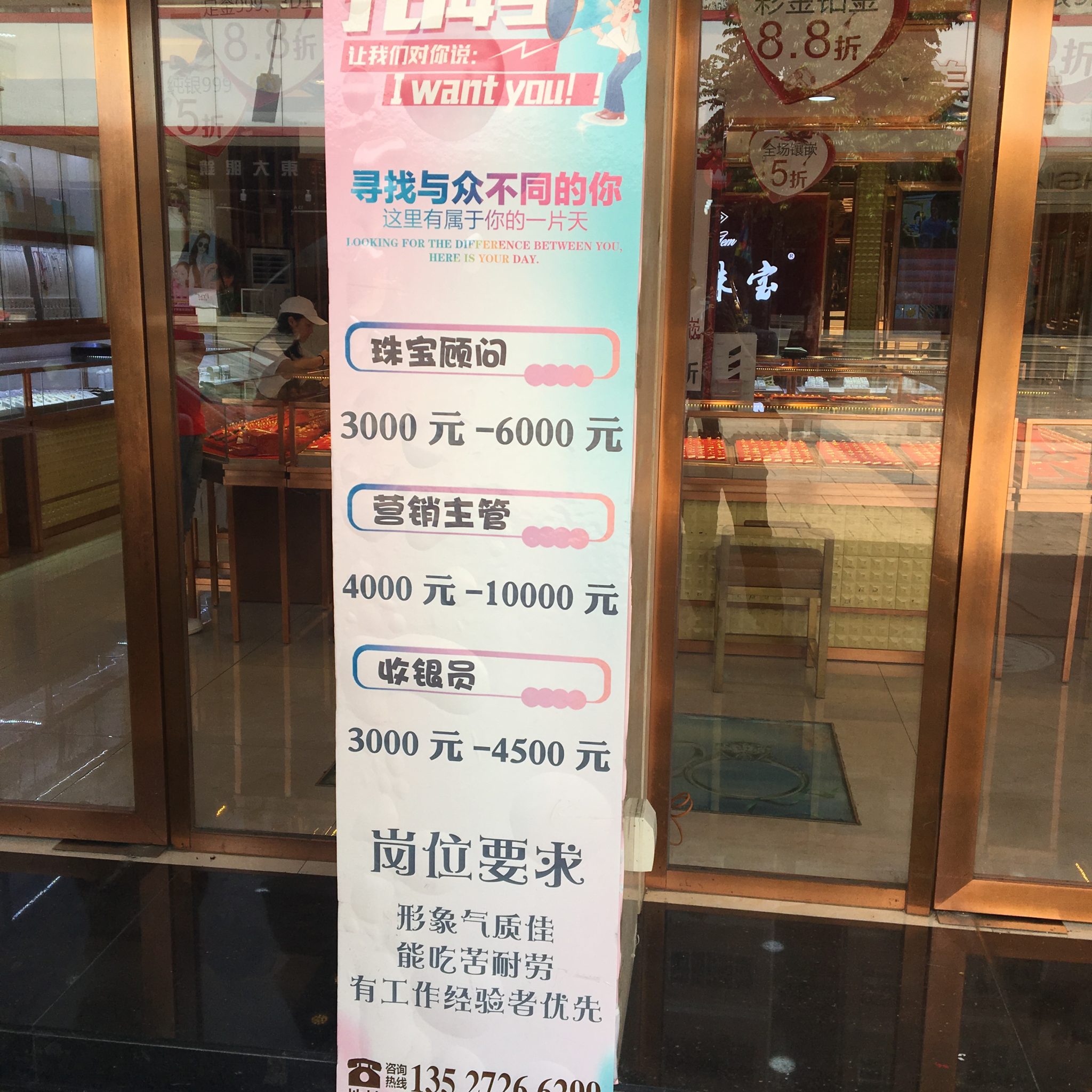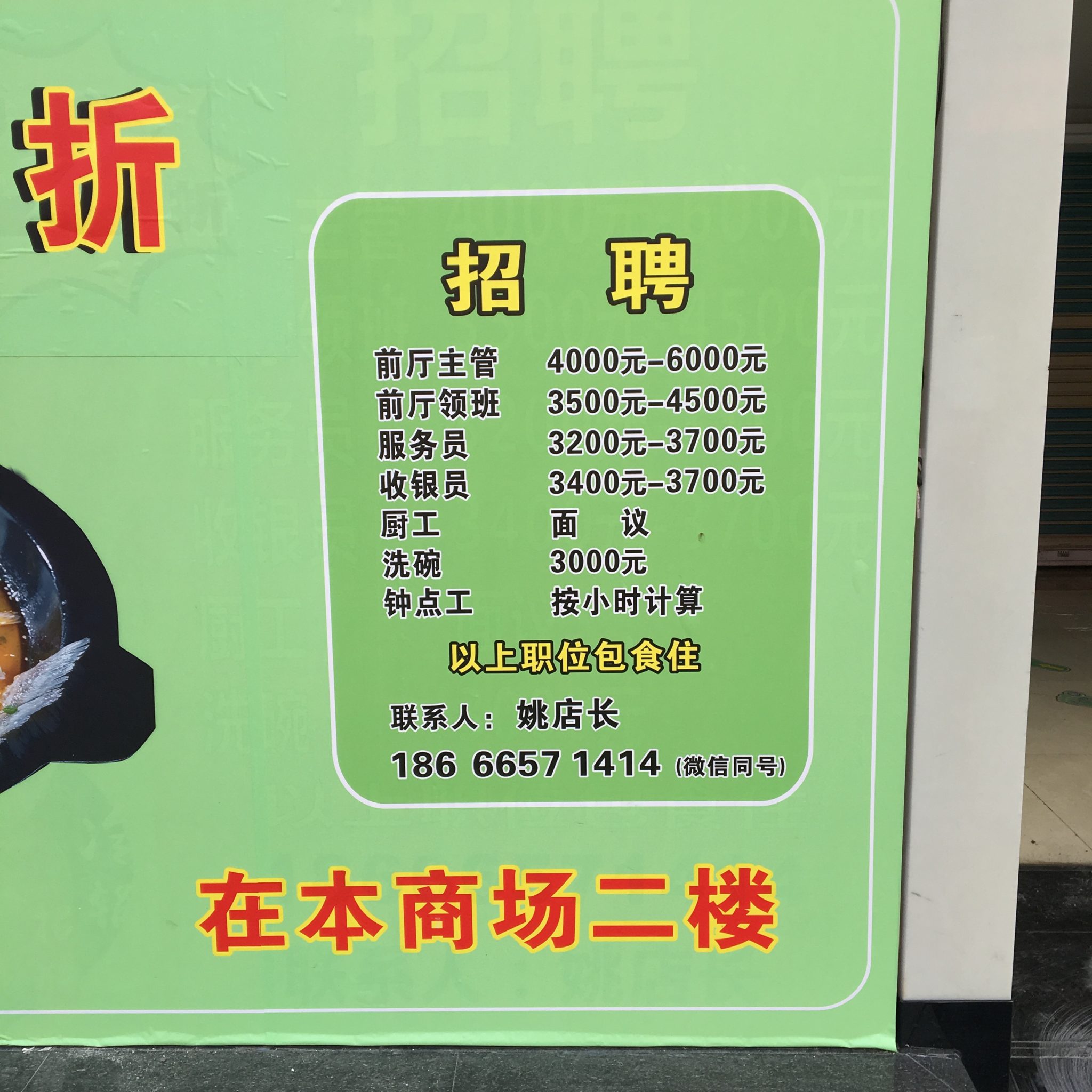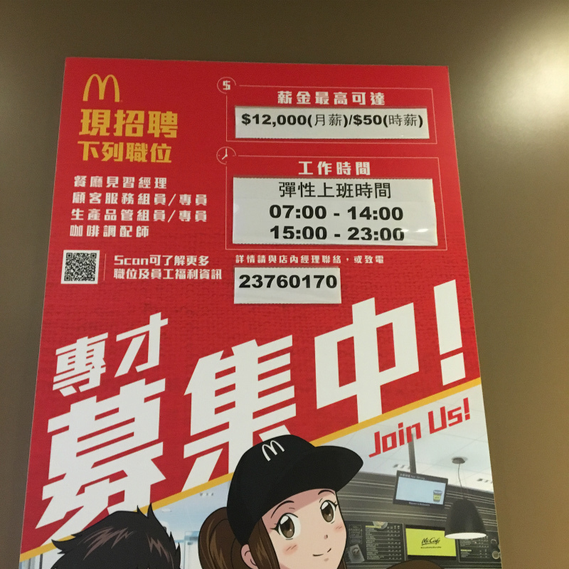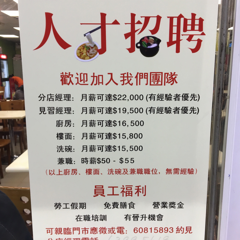 こっちは街のレストランの求人、正社員が15,500元(217000円)時給55香港ドル770円なのでいいですね。