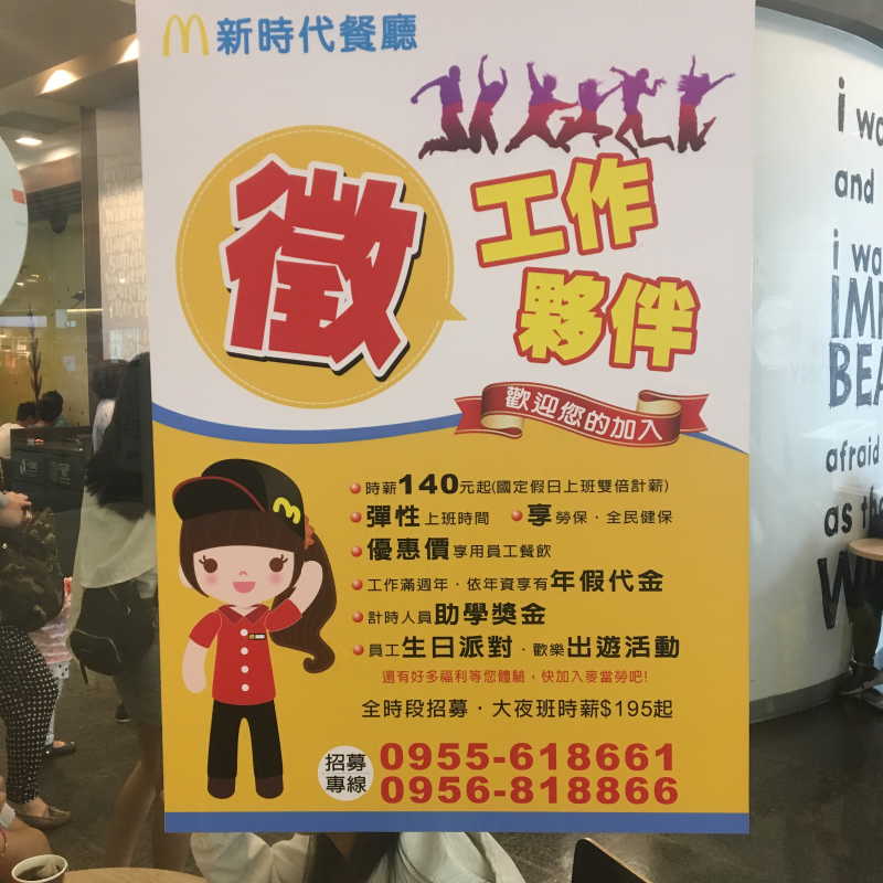 台湾のマックの求人140元500円。深夜は195元700円となっています。台湾のバイトは日本の半分ぐらいをイメージすればいいと思います。