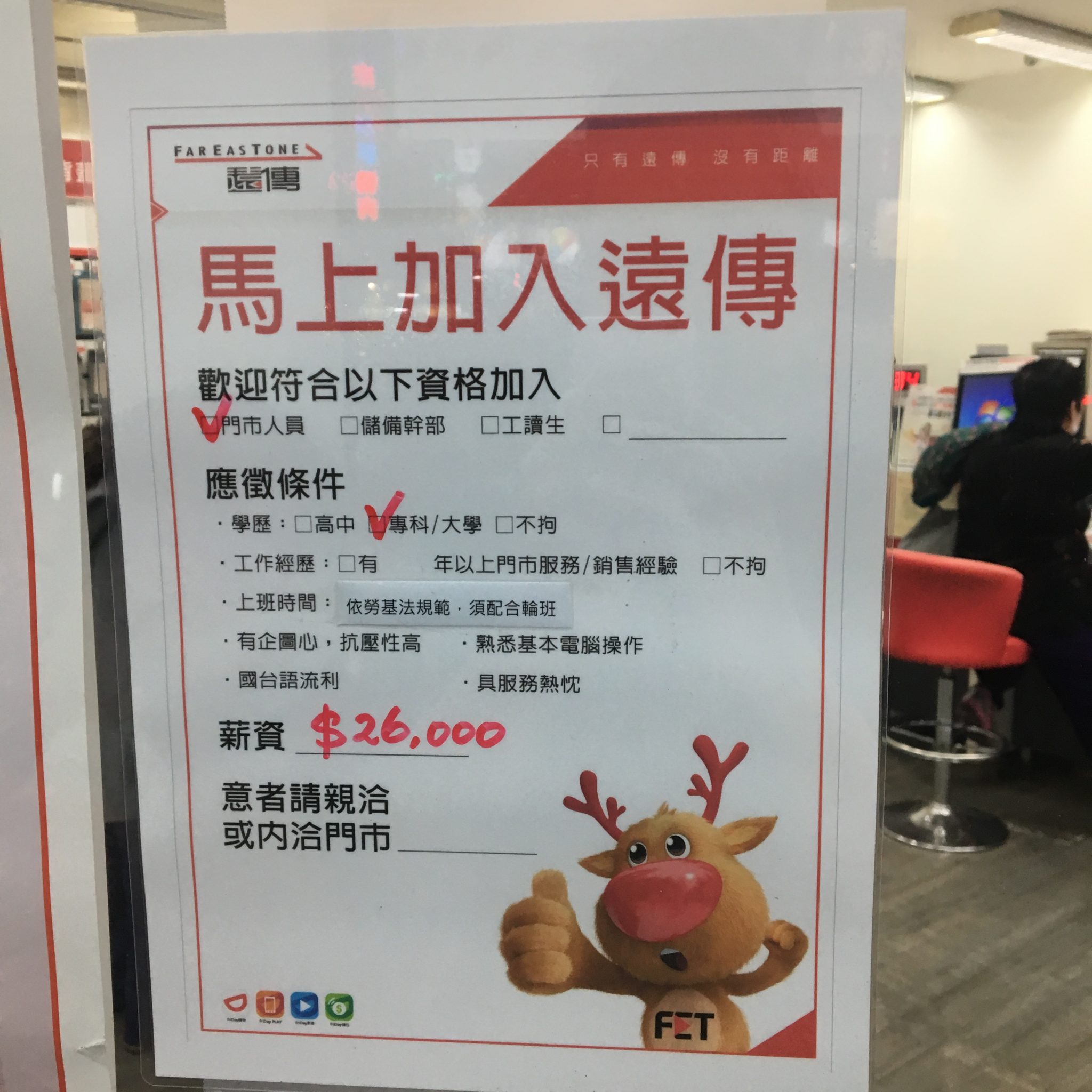 近所の携帯電話ショップ(日本のドコモショップのようなところ)では大卒・専門学校以上で高卒など論外。それでいて月収26,000元(93,600円)です。