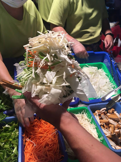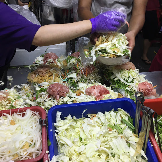特徴は屋台に並んでいる野菜をお椀の中に取り放題でそれをそのまま鉄板で焼いてくれるところ