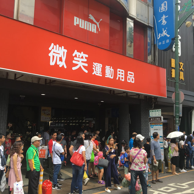 微笑運動用品と言う名前のスポーツ洋品店の前辺りに台中空港行きのバスがあります。