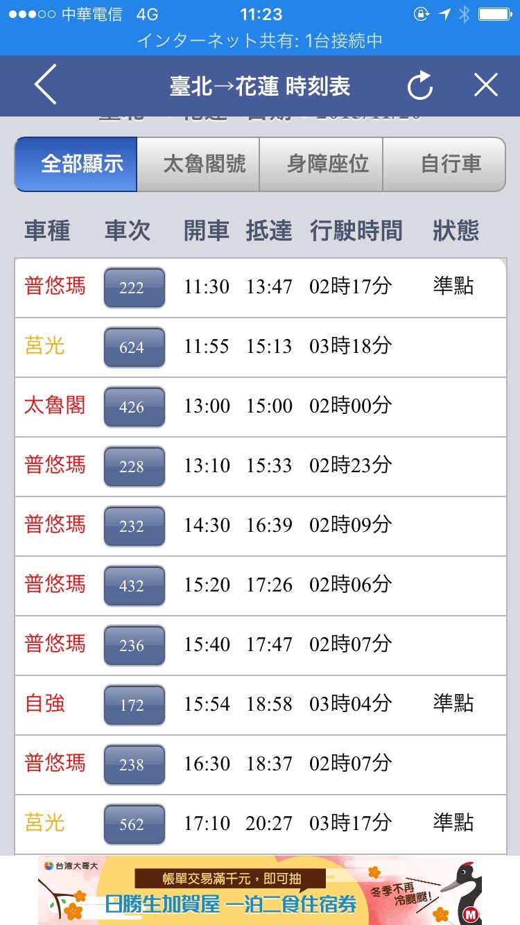 太魯閣号(太魯閣列車)、普悠瑪列車(普悠瑪列車)ともに自強号(自強號)とのことです。ネーミングが違うだけのようです・・・って、ことは立席も可能なのかな?