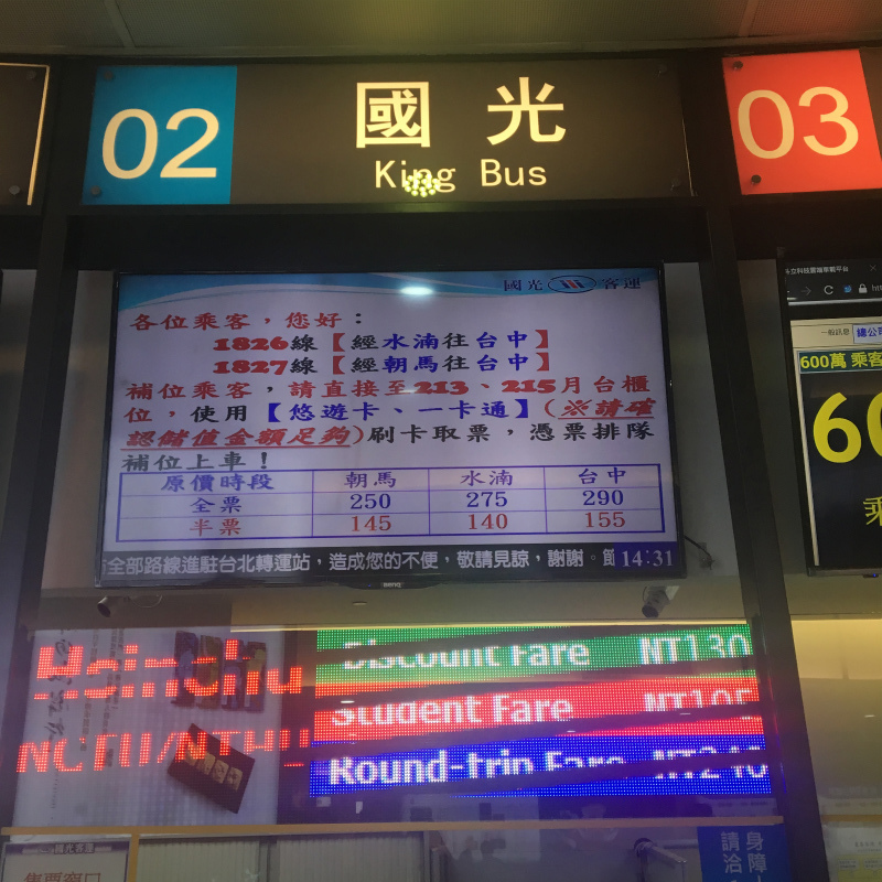 台湾鉄道の台中駅から近くに國光客運の大きなバスターミナルができました。台中の旅に慣れていない方はこちらから乗るのがいいと思います。