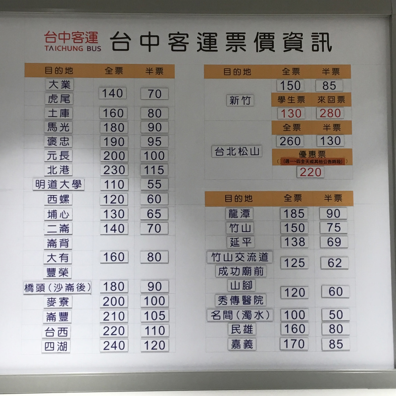 個人的には朝馬バスターミナルをオススメしますが慣れていない方は台中駅が分かり易いのでいいでしょう。